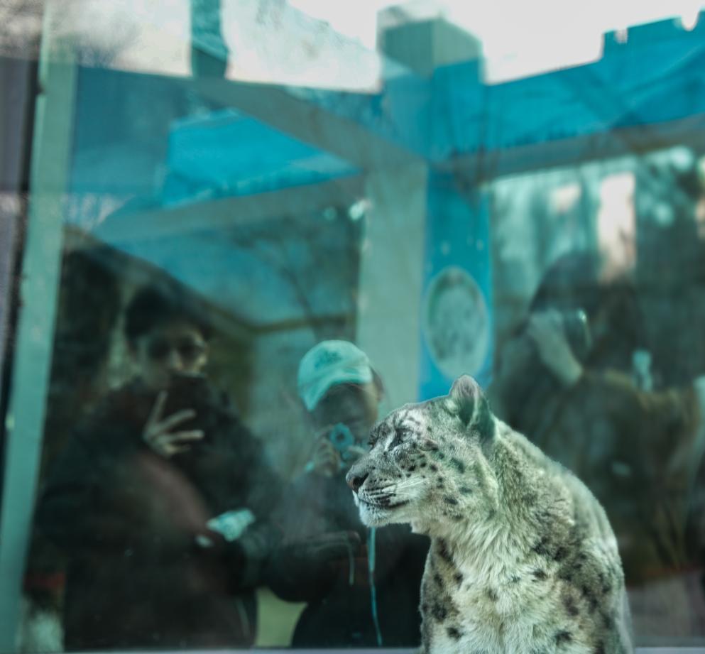 雪豹“凌小蟄”在雪豹館和獸醫(yī)趙海龍隔窗互動。