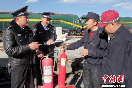 圖為拉薩鐵路公安處民警對(duì)站區(qū)重點(diǎn)部位開展消防安全大檢查。 湯成俊 攝