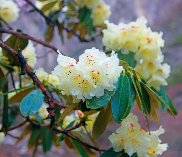 如此豐富的色彩或許與勒布溝景區(qū)內(nèi)杜鵑花的品種有很大的關(guān)系。據(jù)悉,勒布溝內(nèi)共分布著大葉杜鵑、小葉杜鵑和高山杜鵑三大品種。“大葉杜鵑花,其實(shí)叫杜鵑‘樹’更為貼切,不管是枝干、花葉還是花朵,都比另外兩種杜鵑花要大,花葉比手掌大,而花朵更是如碗口大小。大葉杜鵑主要分布在麻瑪鄉(xiāng)‘野狼谷’附近?!卑⑦呎f。