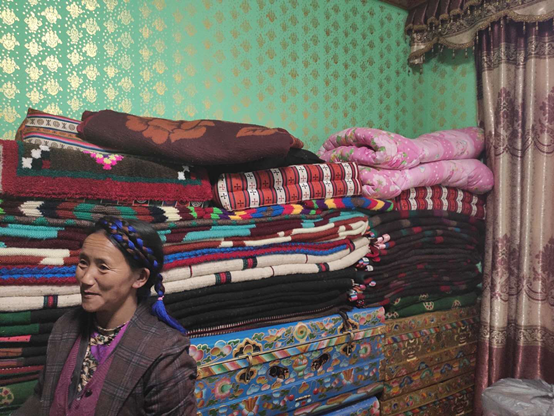 如今,卓瑪家有三層樓,除了自家居住,二樓、三樓提供住宿,一共8間房,可以住16位客人。一樓代賣當(dāng)?shù)氐奶厣a(chǎn)品,柜臺(tái)里,門巴木碗、糌粑、蕎麥酒等擺放整齊。照應(yīng)客人的閑暇,卓瑪還會(huì)做一些毛線手工編織售賣。算下來,一年的收入有10萬多元。