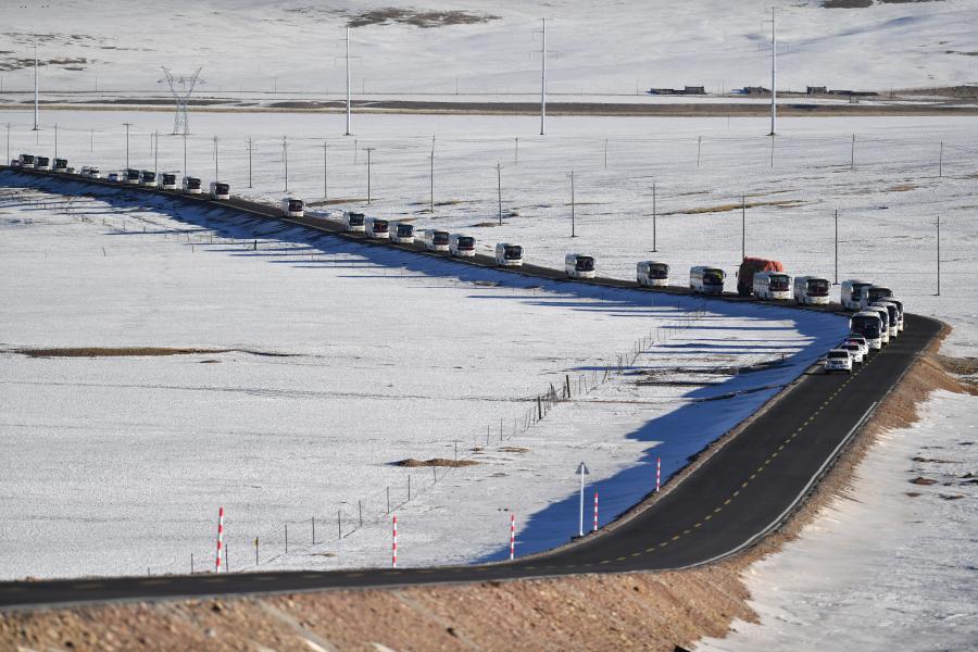 告別平均海拔5000米家鄉(xiāng)的雙湖縣牧民們乘車搬遷至海拔相對較低的藏南雅魯藏布江南岸的貢嘎縣境內(nèi)(2019年12月23日攝)。新華社記者 覺果 攝