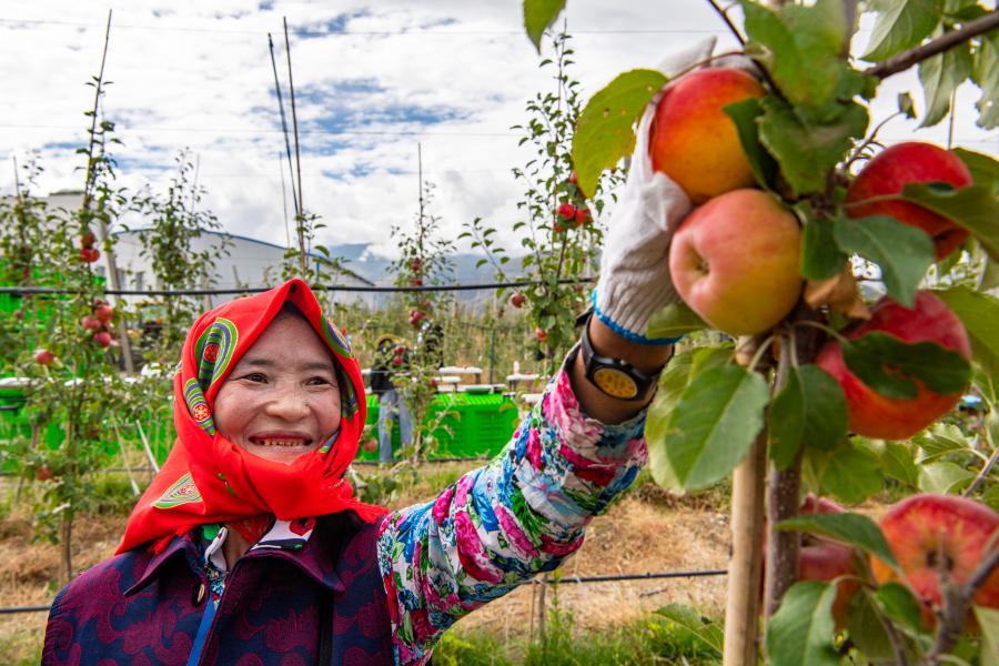 來自雙湖縣措折強瑪鄉(xiāng)才瑪榮村的搬遷群眾嘎瑪在山南市貢嘎縣森布日搬遷安置點的蘋果園內(nèi)采摘蘋果(2020年9月23日攝)。新華社記者 孫非 攝