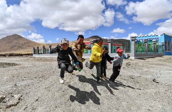 在我國海拔最高的行政鄉(xiāng)——西藏山南市浪卡子縣普瑪江塘鄉(xiāng),小朋友們在新建成的幼兒園前玩耍。記者 晉美多吉 攝