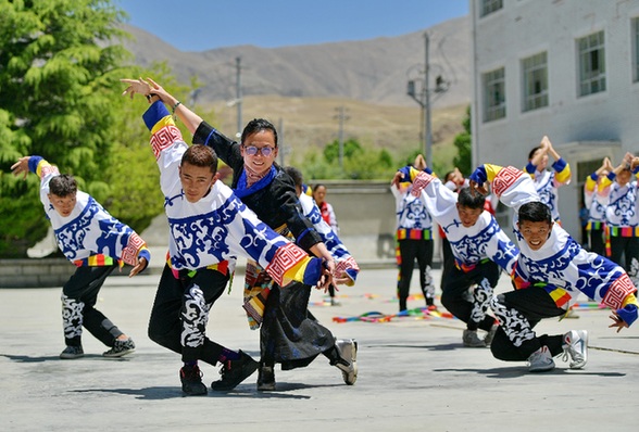 在西藏山南市第一高級中學,來自湖北省武漢市旅游學校的援藏教師馬丹(左三)指導學生練習校園啦啦操。記者 張汝鋒 攝