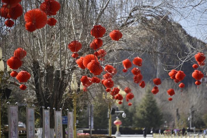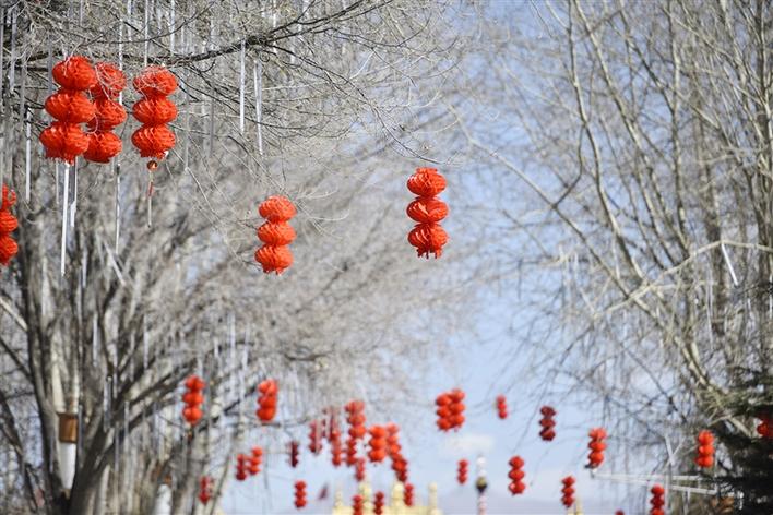 紅色總會(huì)給人以一種喜慶的感覺!走在拉薩的街頭,一串串紅彤彤的燈籠高高掛在樹枝上,錯(cuò)落有致,格外吸引眼球。除了大街小巷上用于裝飾的紅燈籠,過年時(shí)每個(gè)人家里也必定少不了紅色的點(diǎn)綴,走進(jìn)年貨市場(chǎng),人們左顧右盼,精心挑選著印有“扎西德勒”、“吉祥如意”等字樣的對(duì)聯(lián)、年畫,此外,各種“?!痹氐募槲飩涫苁忻袂嗖A。