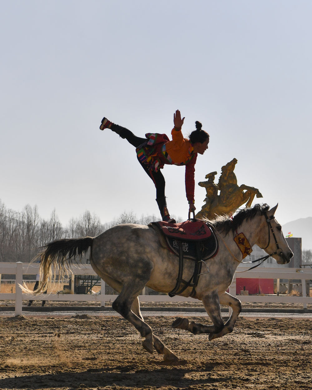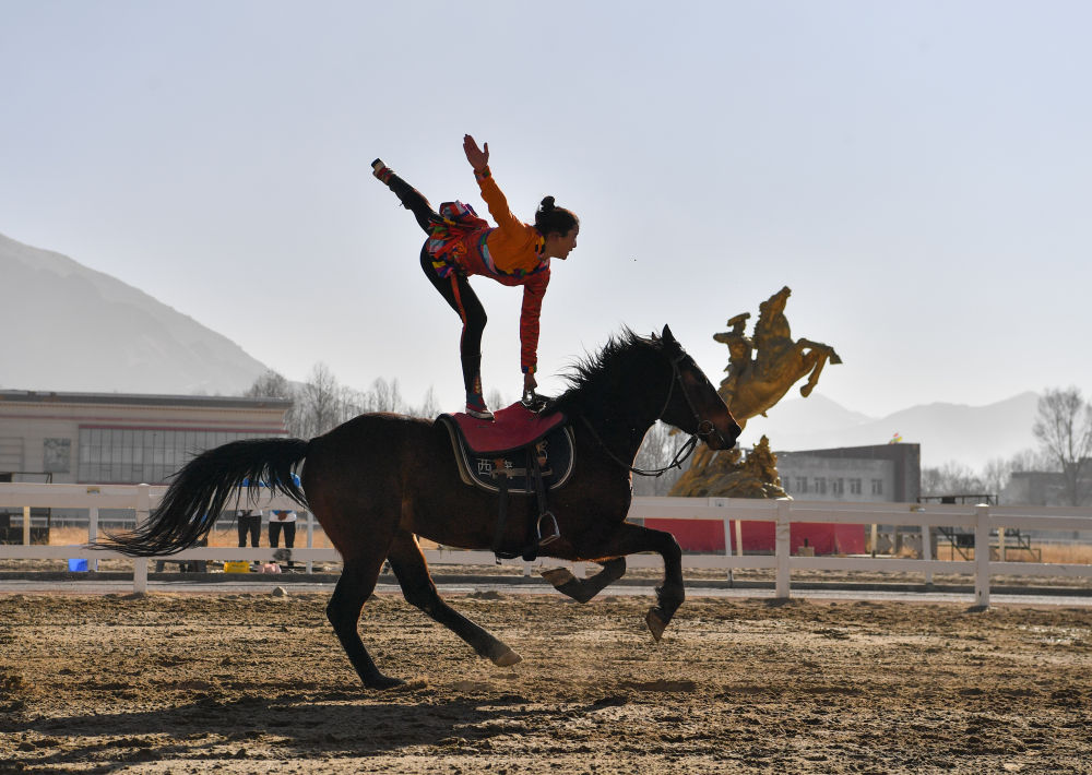 2月14日,為慶祝藏歷新年,西藏自治區(qū)體育局組織自治區(qū)馬術(shù)隊在拉薩北郊賽馬場舉行馬術(shù)表演。因疫情防控需要,這次表演被搬到“線上”,通過網(wǎng)絡(luò)直播發(fā)布。