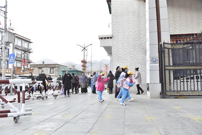 3月2日早上8時(shí)許,拉薩市第一小學(xué)門(mén)口熱鬧非凡。孩子們?cè)诩议L(zhǎng)的護(hù)送下背著書(shū)包、系著紅領(lǐng)巾,經(jīng)過(guò)體溫測(cè)量、消毒等疫情防控工作后,興奮地邁入校門(mén)。進(jìn)入校園后,爭(zhēng)著跟每一位老師問(wèn)好,迫不及待地和許久不見(jiàn)的同學(xué)分享愉快的假期生活?!伴_(kāi)學(xué)了,我又能和同學(xué)們一起上課、玩耍,還能見(jiàn)到喜歡的老師,心里特別高興?!弊楷斃放d奮地說(shuō),“假期我們?nèi)叶既コ啥加瓮媪?,我給班里的小伙伴們都帶了禮物,希望他們會(huì)喜歡。”
