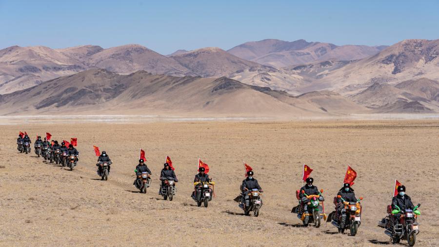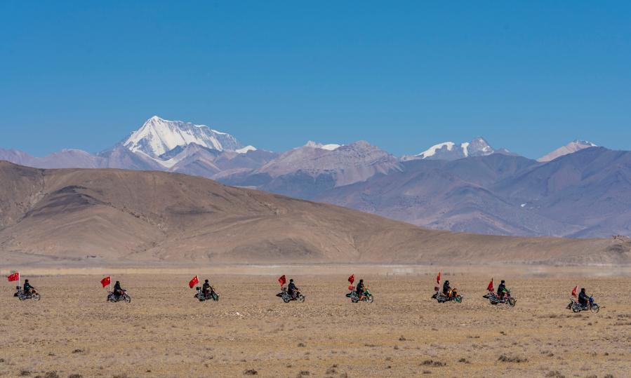 西藏日喀則市薩嘎縣昌果鄉(xiāng)的一處村莊里,48歲的藏族漢子石覺(jué)塔布在風(fēng)中跨上一輛摩托車(chē),向平坦無(wú)垠的高原邊緣騎去。他的車(chē)尾插著一面五星紅旗,被風(fēng)吹得獵獵作響,即便駛出很遠(yuǎn),那抹紅色在車(chē)輪卷起的煙塵中也依然醒目。
