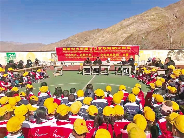 為紀(jì)念西藏百萬(wàn)農(nóng)奴解放62周年,仁布縣查巴鄉(xiāng)小學(xué)開展“說(shuō)農(nóng)奴苦,訴新生甜”中華經(jīng)典朗誦比賽。