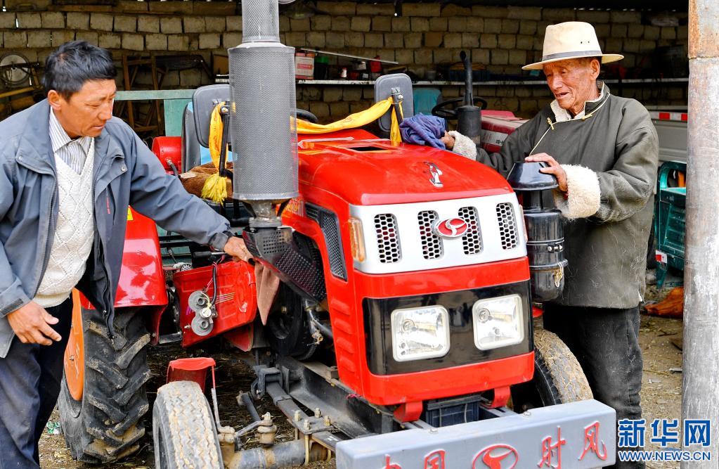 多扎木(右)在擦拭自家的拖拉機(3月20日攝)。新華社記者 張汝鋒 攝
