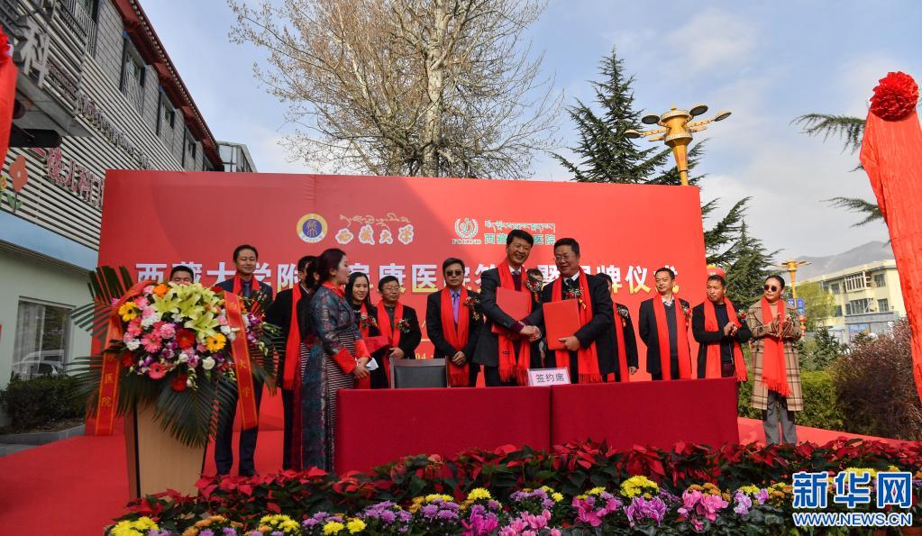 西藏大學(xué)附屬阜康醫(yī)院簽約暨揭牌儀式現(xiàn)場(4月7日攝)。