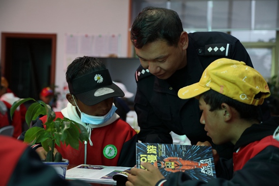 亞東出入境邊防檢查站圖書室對駐地中學(xué)學(xué)生開放,民警為學(xué)生講解書本知識。張雨強(qiáng) 攝