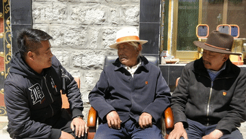 頓珠旺杰(中)、普布(右)、達瓦桑布(左)祖孫三人在促膝長談(4月5日攝)。新華社記者 孫陽 攝