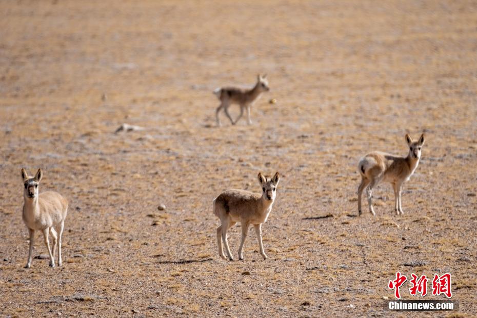 “五一”小長假,中新網(wǎng)記者沿省干線公路自駕西藏自治區(qū)那曲羌塘草原腹地雙湖縣、申扎縣及班戈縣等地,看到當(dāng)?shù)夭亓缪?、藏野驢、藏原羚等成群覓食。羌塘草原平均海拔4500多米,對人類而言氣候條件惡劣,但動(dòng)物們卻將此作為“天堂”。圖為5月3日,西藏班戈縣草原上的4只藏原羚,當(dāng)?shù)啬撩穹Q為黃羊。江飛波 攝