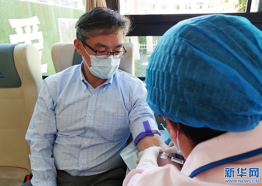 5月27日,來自北京協(xié)和醫(yī)院的援藏專家楊筱在獻血。(新華網(wǎng) 旦增努布攝)