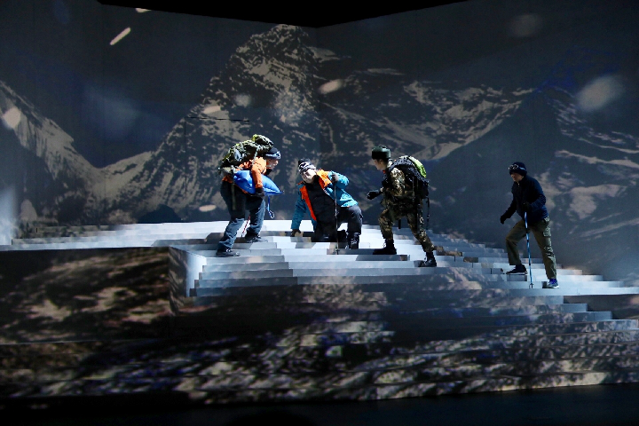 舞臺上,話劇《種子天堂》劇情進(jìn)入最高潮——在缺氧、強(qiáng)風(fēng)惡劣環(huán)境下,鐘揚(yáng)拼盡氣力來到海拔6000米的高度。當(dāng)他終于在一堆雜草和冰雪中發(fā)現(xiàn)那株頑強(qiáng)的雪蓮時,就像父親看到自己剛出生的嬰兒,臉上掛著深深的喜悅,凝望良久……