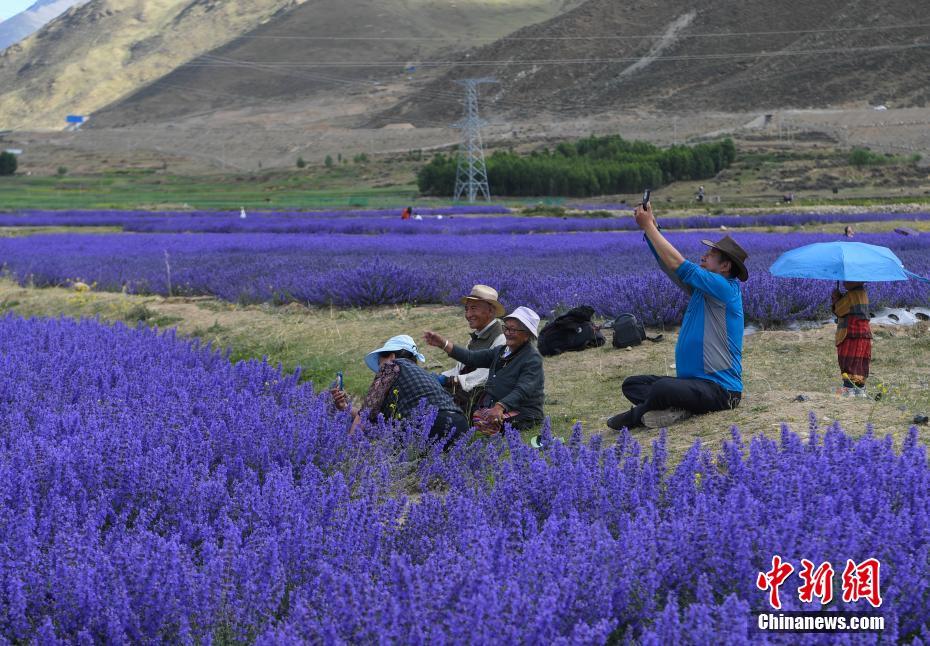 6月25日,位于西藏自治區(qū)拉薩市達孜區(qū)新倉村貝拉莊園的100畝薰衣草花海競相綻放,吸引不少游客和當(dāng)?shù)厥忻袂皝碛瓮?、拍照。中新社記?貢嘎來松 攝