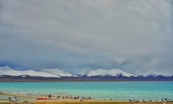 從羊八井出發(fā)至當(dāng)雄縣,有一條向左的岔路,沿著這條路一直向前開約60公里,就能到達(dá)西藏最著名的景區(qū)之一——納木措。納木措,湖面海拔4718米,形狀近似長方形,東西長70多千米,南北寬30多千米,湖的東南部是直插云宵、終年積雪的念青唐古拉山主峰,清澈的湖水便來自念青唐古拉山融化的冰雪,北側(cè)則倚偎著和緩連綿的高原丘陵,廣闊的草原繞湖四周,似是將納木措小心翼翼地護(hù)在懷中。湖水顏色由罕見的碧藍(lán)與碧綠色相結(jié)合,是畫師都不易調(diào)出的顏色,遠(yuǎn)遠(yuǎn)望去,碧波粼粼的湖水與周圍的山脈、草原、藍(lán)天、白云交相輝映,令在場的人不禁連連感嘆仿佛置身于仙境之中。