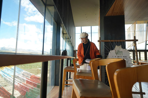 從正門進(jìn)入,穿過牦牛文化空間走廊,便可到能夠以最佳視角欣賞念青唐古拉山的VR觀景臺。緊鄰觀景臺右側(cè),是一間擺放當(dāng)?shù)匚膭?chuàng)產(chǎn)品、各類書籍的觀景咖啡廳。該咖啡廳的兩面墻體設(shè)計(jì)為超大落地窗,在此休息的游客可以邊品嘗咖啡,邊欣賞念青唐古拉山及拉多草原的美景。走進(jìn)咖啡廳,記者看到不少在這里休息的游客都在低頭寫著什么,經(jīng)咖啡廳負(fù)責(zé)人介紹:“這些游客是在寫明信片,我們這里不僅提供餐飲,還提供印有本地風(fēng)景的明信片,并同中國郵政合作,幫助游客按時(shí)將明信片寄到他們的親朋好友手中,讓游客們的旅途變得更有意義?!?/p>