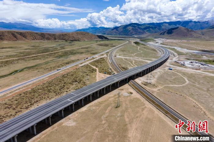 圖為航拍G6京藏高速那曲至羊八井段,目前該段高速主線已全部完成建設(shè),通車在即?!〗w波 攝