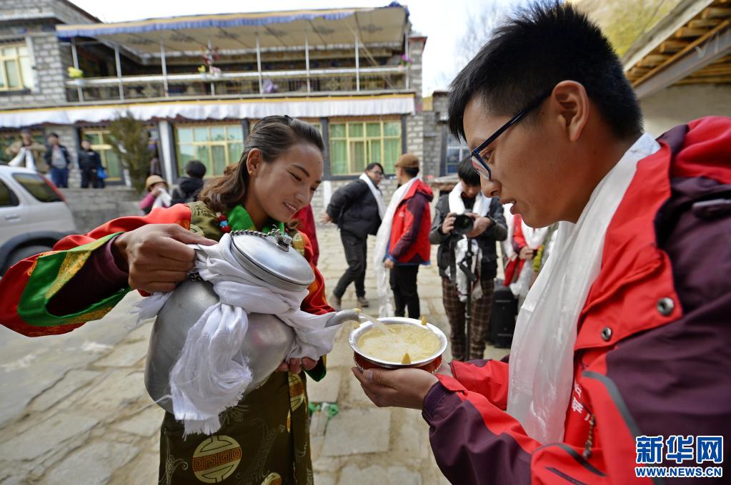 2016年11月15日,在拉薩市奪底鄉(xiāng)維巴村,一名民宿負(fù)責(zé)人為剛抵達(dá)的游客斟滿青稞酒。 劉東君 攝