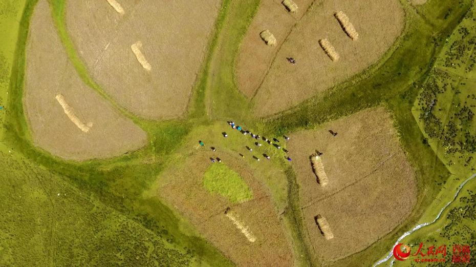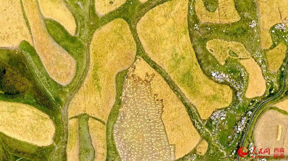 九月的西藏,已進(jìn)入青稞成熟收割時(shí)節(jié)。記者來(lái)到拉薩市曲水縣熱堆村,成片成片成熟了的青稞,金黃耀眼。村民們抓緊天氣晴好的時(shí)機(jī),互幫互助忙收割,確保顆粒歸倉(cāng)。地頭田間,有的已被割倒束成捆,也有的仍在迎風(fēng)搖曳,等待收割,村民們揮舞著鐮刀,將成熟的青稞收割、扎捆、然后堆砌成一排排整齊的青稞垛子,用拖拉機(jī)將青稞運(yùn)回家,再上架晾曬,看著沉甸甸的麥穗,聞著空氣中彌漫著沁人心脾的青稞香,村民們臉上露出了喜悅的微笑。無(wú)人機(jī)鳥(niǎo)瞰青稞田地。人民網(wǎng) 次仁羅布攝
