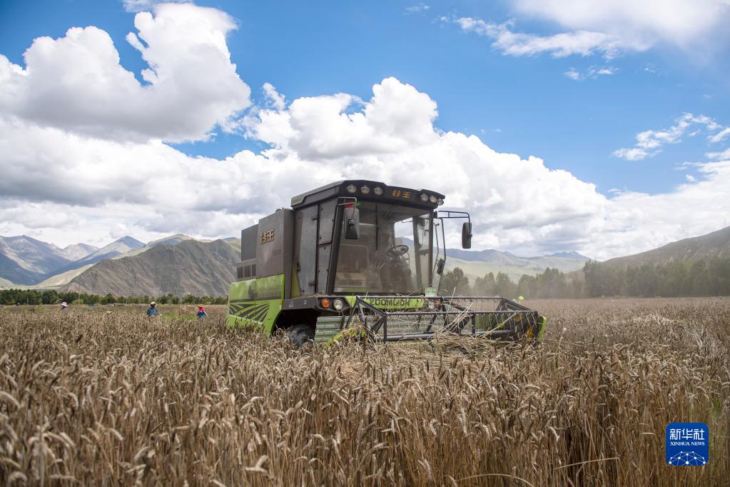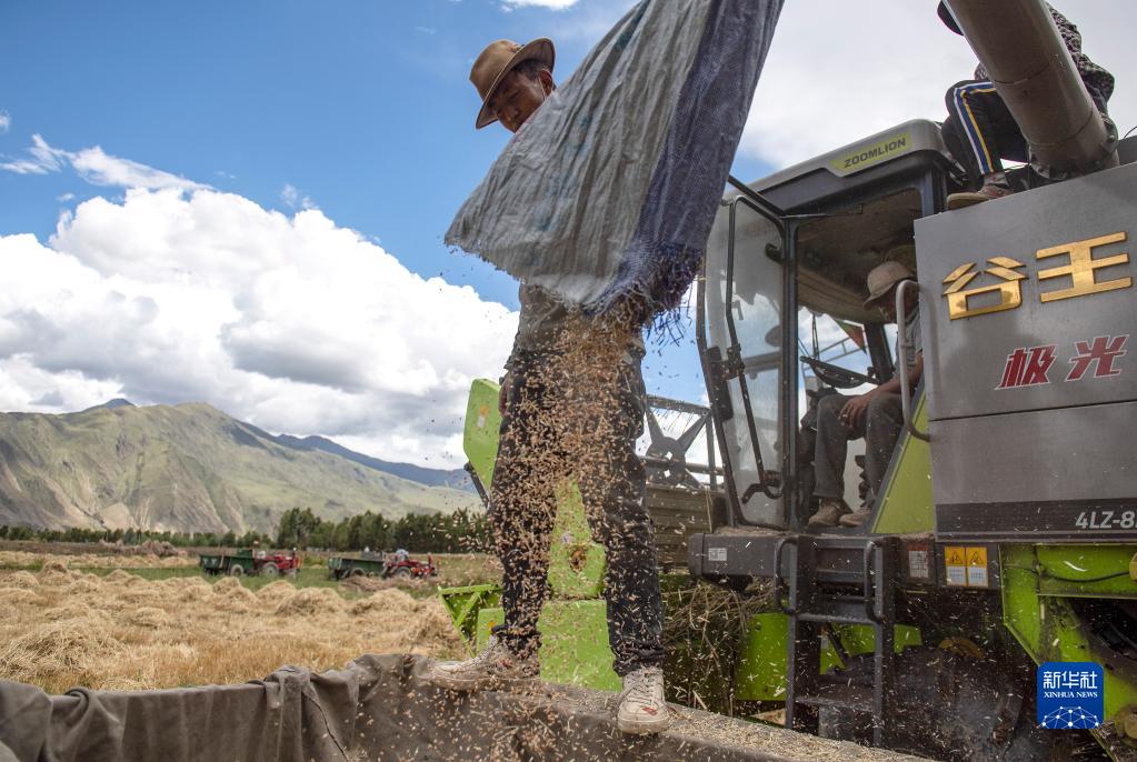 拉薩市達孜區(qū)克日村的農(nóng)民用農(nóng)業(yè)機械收割青稞(9月6日攝)。新華社記者 孫瑞博 攝