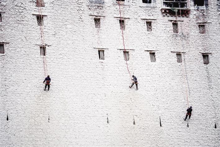 據(jù)悉,工作人員要先對(duì)涂料進(jìn)行過(guò)濾,然后再進(jìn)行噴灑。而人力無(wú)法抵達(dá)的地方則由專業(yè)人員化身“蜘蛛人”用涂料噴槍進(jìn)行粉刷。在高空作業(yè)的“蜘蛛人”是經(jīng)過(guò)培訓(xùn)的特定人員,“蜘蛛人”懸掉在空中,并有專人負(fù)責(zé)拉繩,大家齊心協(xié)力完成粉刷工作。
