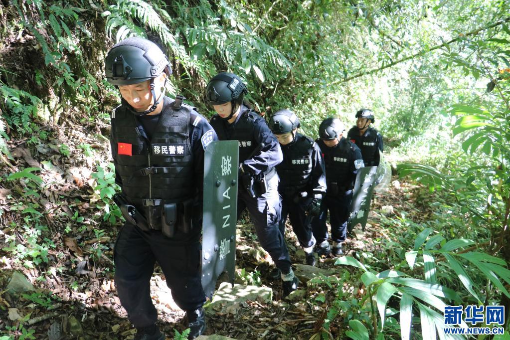 走在隊(duì)伍最前面的是教導(dǎo)員李永杰,他手拿一把砍刀,一邊清理小路兩側(cè)蔓延出來(lái)的枝丫,一邊時(shí)刻關(guān)注身后其他人員的情況。隨著海拔升高,陽(yáng)光從郁郁蔥蔥的樹(shù)葉間撒下縷縷光芒,2名女民警艱難穿行期間,謹(jǐn)慎觀察著周?chē)闆r后前行。