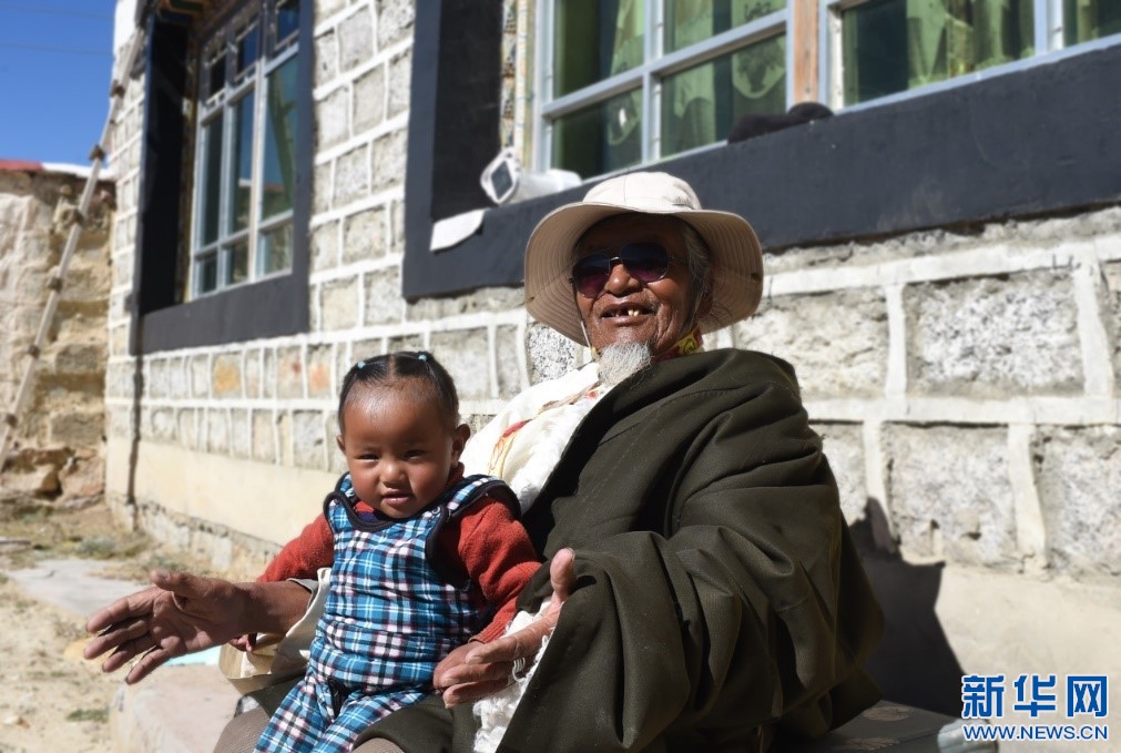 10月30日,扎塔老人和孫女在院子里曬太陽。新華網(wǎng) 旦增努布 攝