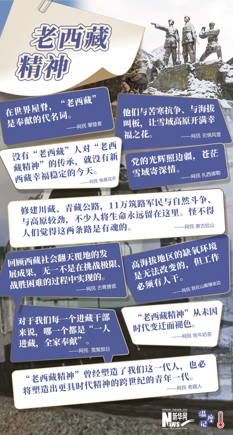 此后的幾十年間,一批又一批、一代又一代援藏干部、駐藏官兵踏上世界屋脊,扎根雪域高原,和當(dāng)?shù)厝罕娨坏?,推?dòng)西藏各項(xiàng)事業(yè)又快又好發(fā)展,讓千年雪域高原變了樣,也賦予“老西藏精神”更為豐富的時(shí)代內(nèi)涵?!吧谶@里很脆弱,生命在這里也很頑強(qiáng)?!本W(wǎng)民們?cè)谏缃黄脚_(tái)上表達(dá)對(duì)雪域高原心向往之的同時(shí),更不忘歌頌歷久彌新的“老西藏精神”。歷經(jīng)時(shí)代的變遷,這種精神正在感召并鼓舞更多人,扎根邊疆,造福西藏,讓那里的山水永遠(yuǎn)碧藍(lán)、綺麗,讓那里的土地永遠(yuǎn)充滿希望、幸?;ㄩ_(kāi)。(文字:徐可 海報(bào)設(shè)計(jì):王曄)