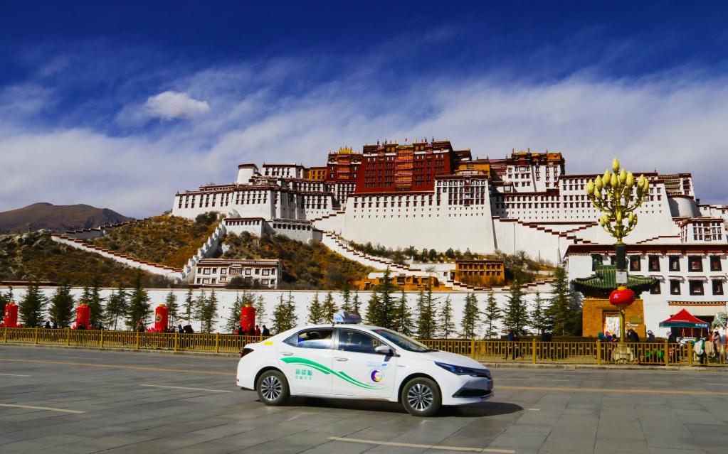 新能源出租車從布達(dá)拉宮廣場(chǎng)前駛過(2018年2月11日攝)。 新華社發(fā) 央梅朵 攝