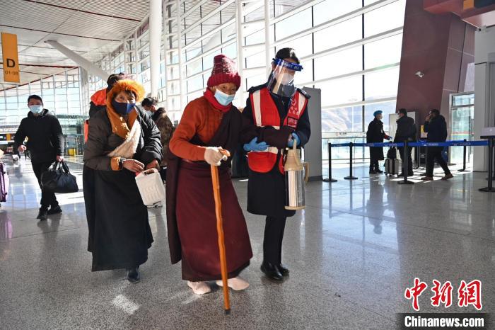 圖為在拉薩貢嘎機場,多個臨時點位安排了志愿者為旅客提供服務(wù)。貢嘎來松 攝