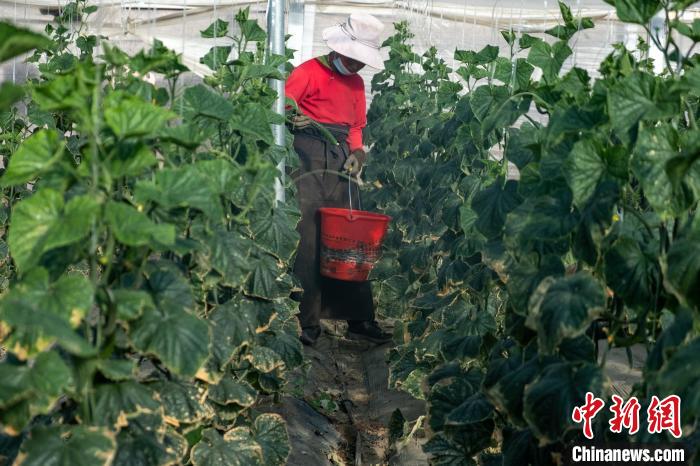 圖為農(nóng)牧民采摘黃瓜。江飛波 攝