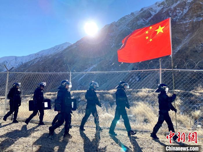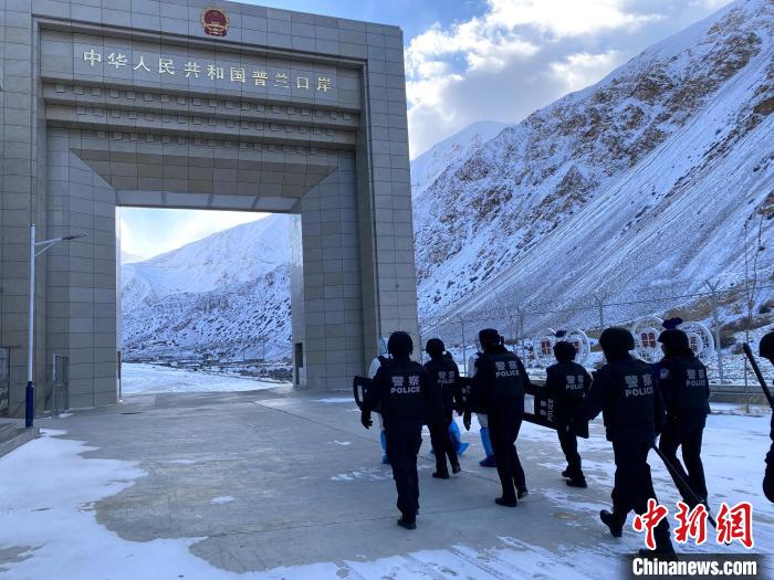 圖為普蘭邊檢站民警在邊境國(guó)門(mén)巡邏?!「駸帷z