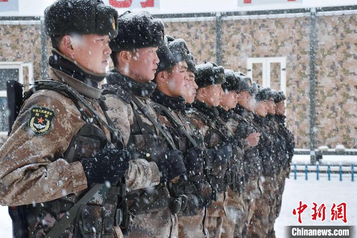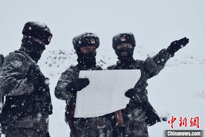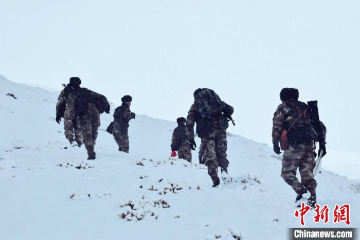 由于道路積雪較厚,車輛無(wú)法通行。官兵們采取徒步方式向點(diǎn)位前行,巡邏分隊(duì)在風(fēng)雪中艱難前行,隨著海拔的逐漸增加,氧氣愈發(fā)稀薄,此時(shí)的氣溫已經(jīng)接近零下30攝氏度。