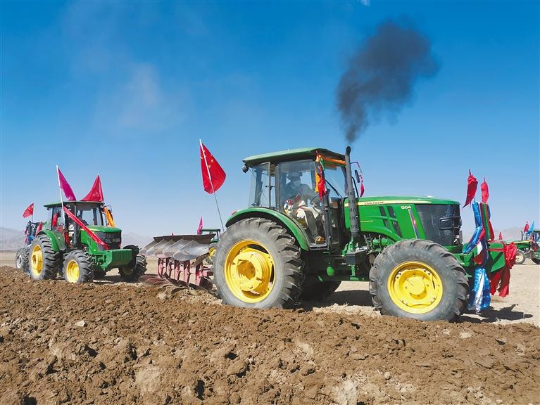在桑珠孜區(qū)曲美鄉(xiāng)拉貴村春耕儀式上,村民用大型農(nóng)用機械開耕犁地。記者 扎西頓珠 攝