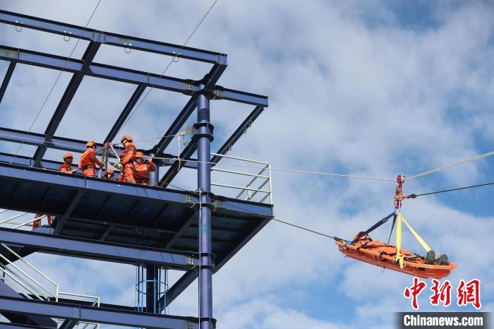 圖為消防指戰(zhàn)員利用橫渡系統(tǒng)轉(zhuǎn)運(yùn)傷員。 林芝市森林消防支隊 攝