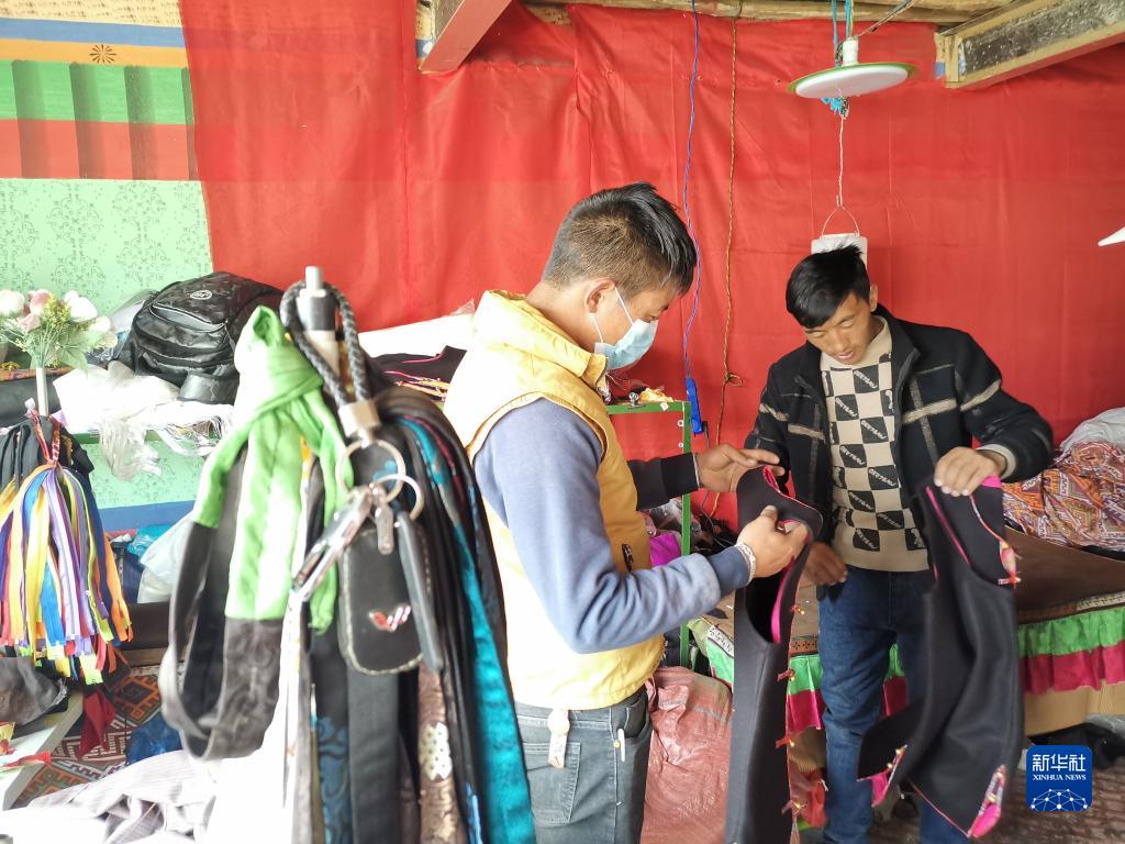 特布拉村村民拉巴平措(右)在介紹他制作的藏裝。新華社記者 林建楊 攝(手機(jī)照片,4月16日攝)