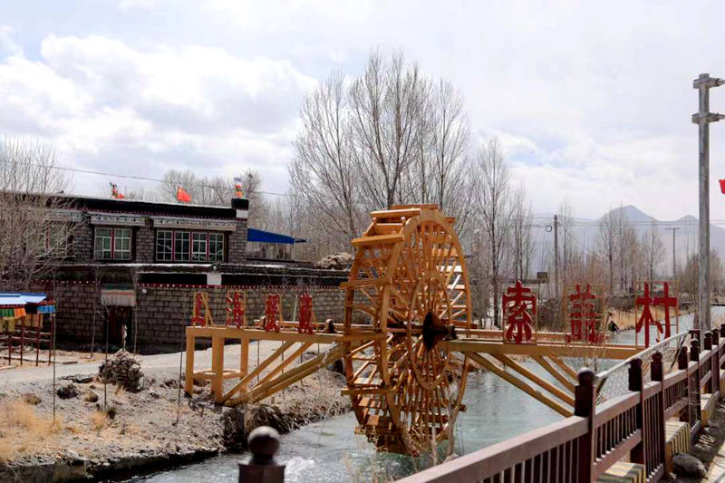 走進(jìn)索蓋村,映入眼簾的就是一架大水車,上面刻著“上海援藏 索蓋村”四個小字、三個大字。