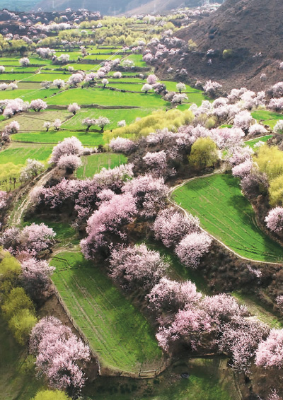 桃花與田野錯落有致地分布在林芝大地上。扎洛攝
