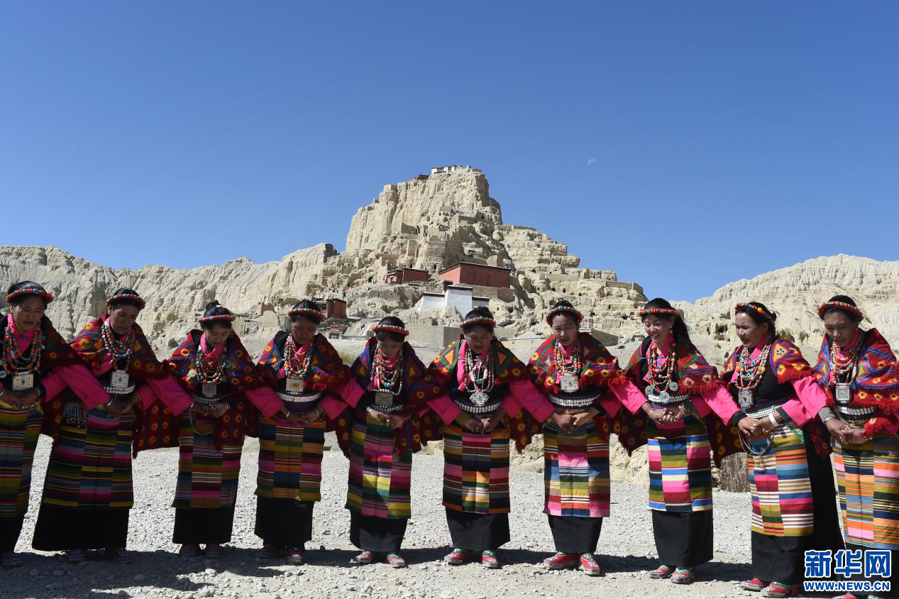 4月23日,當?shù)厝罕娫诠鸥裢醭z址腳下表演宣舞。新華網(wǎng) 旦增努布攝