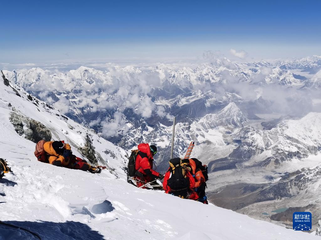 5月4日,科考隊員登上珠穆朗瑪峰峰頂。新華社特約記者 索朗多吉 攝