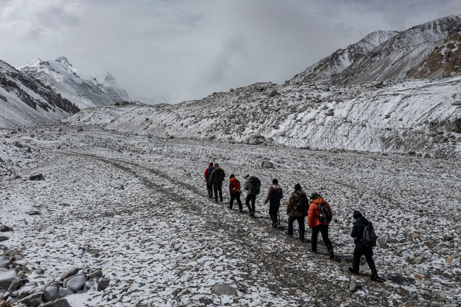 冰川與污染物小組在東絨布冰川行進(5月6日攝,手機照片)。新華社發(fā)(受訪者供圖)