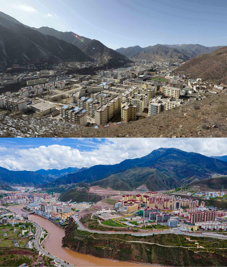 拼版照片:上圖是2009年3月15日拍攝的昌都(新華社記者 普布扎西 攝);下圖是2022年5月22日拍攝的昌都市卡若區(qū)(新華社記者 周荻瀟 攝,無人機(jī)照片)。新華社發(fā)