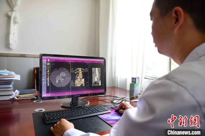 圖為何蔚副主任醫(yī)師仔細翻閱患者CT片子。 貢嘎來松 攝