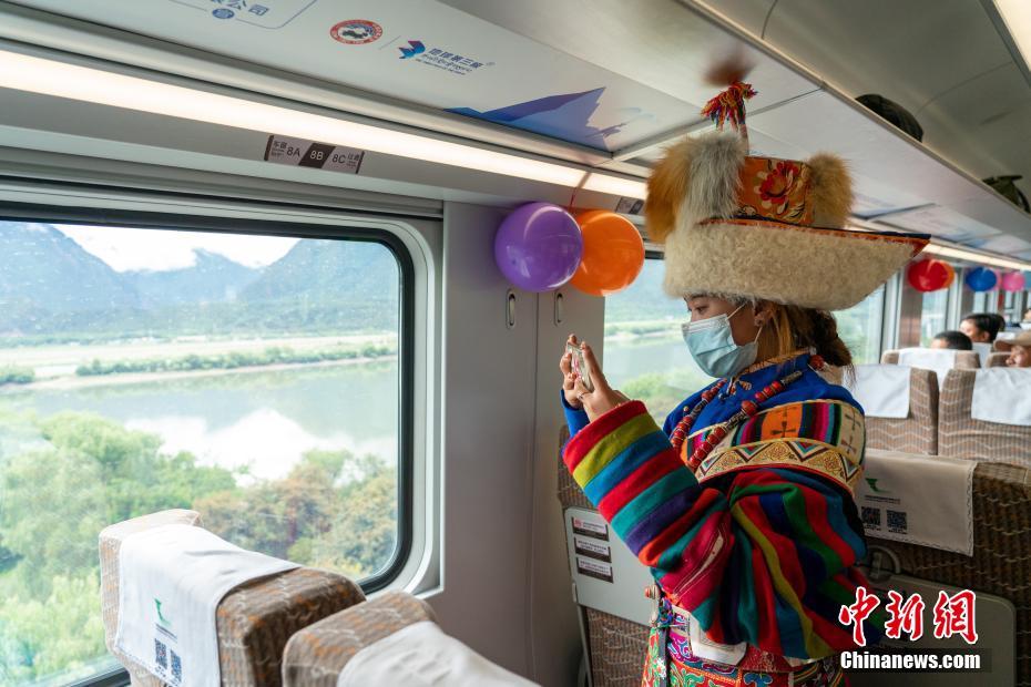 圖為當(dāng)日,西藏拉林鐵路通車(chē)一周年活動(dòng)上,那曲安多牧民德吉次仁身著傳統(tǒng)盛裝首次體驗(yàn)高原復(fù)興號(hào),在進(jìn)入林芝后記錄“雪域江南”風(fēng)光。 中新社記者 江飛波 攝