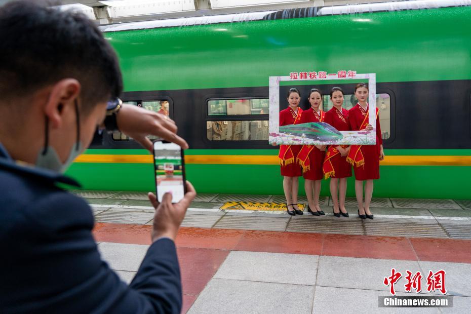 圖為當(dāng)日清晨,拉薩火車(chē)站,C881次列車(chē)出發(fā)前,“動(dòng)姐”們?cè)诟咴瓘?fù)興號(hào)前合影留念,紀(jì)念拉林鐵路通車(chē)一周年。 中新社記者 江飛波 攝