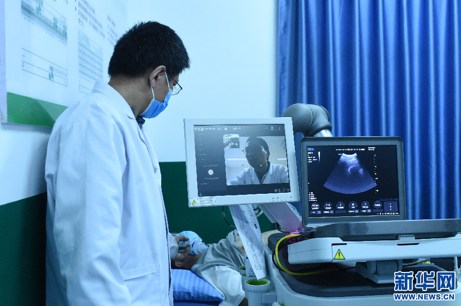 圖為醫(yī)生通過5G遠(yuǎn)程超聲診斷的形式進(jìn)行會(huì)診(6月20日攝)。新華網(wǎng)旦增努布 攝