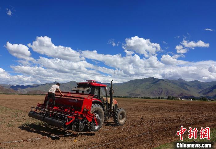 6月末的林周縣曲嘎強村,村民們正在播種燕麥飼草,機器在田間穿梭不停,一派繁忙的勞作景象。